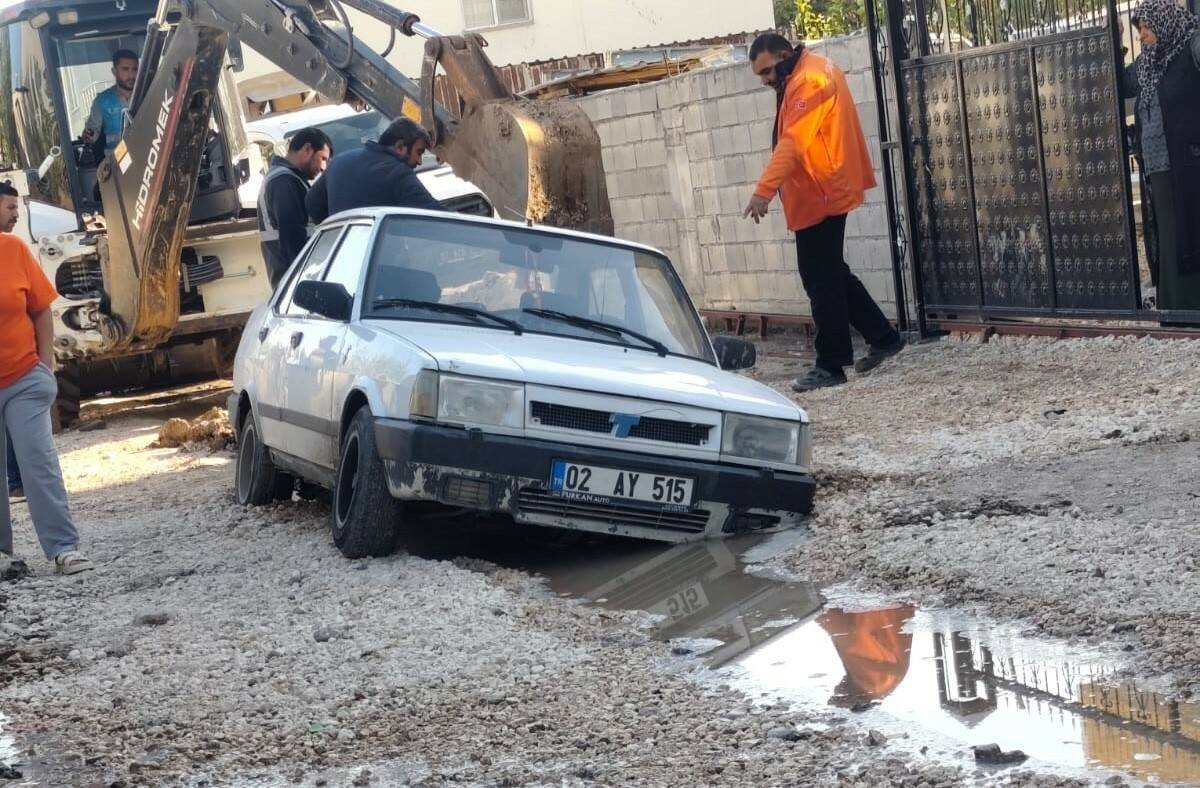 ADIYAMAN’DA BİR OTOMOBİL, ALT YAPI ÇALIŞMASI SONRASI DOLDURULAN YOLDA MEYDANA GELEN ÇÖKME SONUCU ÇUKURDA MAHSUR KALDI.