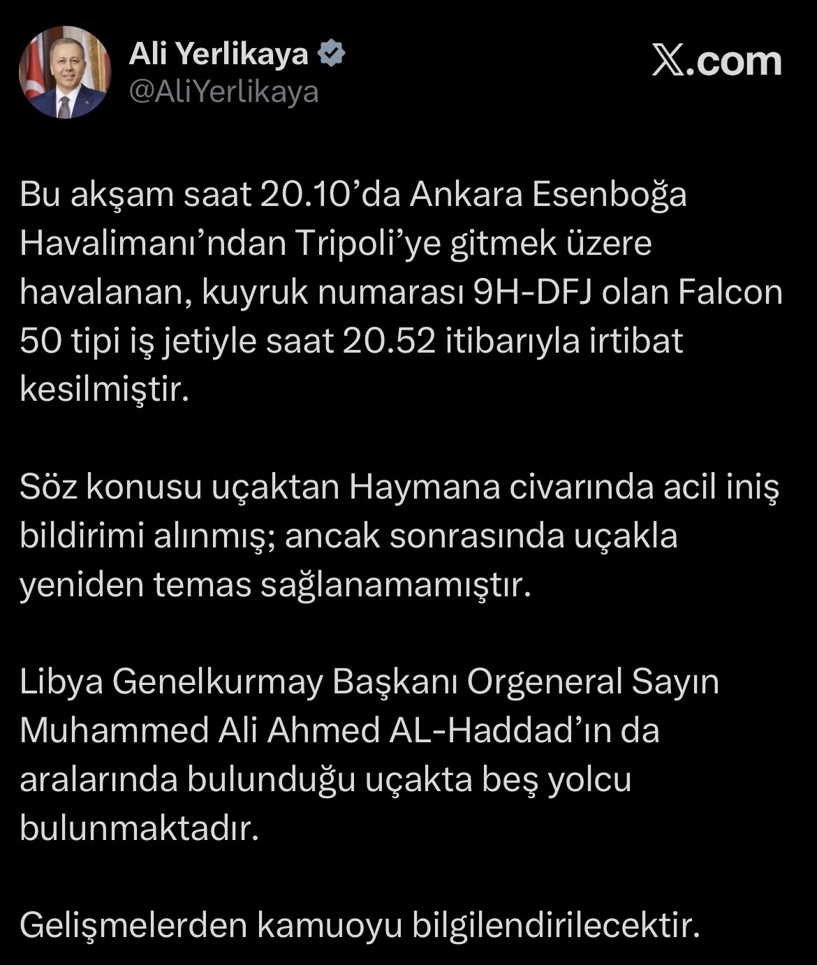 Bakan Yerlikaya’nın X hesabından yaptığı paylaşıma göre, bu akşam saat 20.10’da Esenboğa Havalimanı’ndan havalanan, kuyruk numarası 9H-DFJ olan Falcon 50 tipi iş jetiyle saat 20.52 itibarıyla temas sağlanamadı.