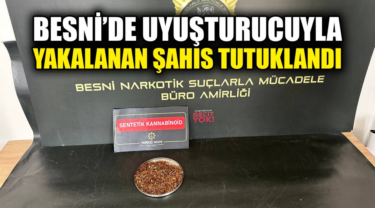 Besni Narkotik Suçlarla Mücadele Büro Amirliği ekipleri, bir şahsın üzerinde yüklü miktarda uyuşturucu madde bulunduğu yönünde alınan ihbar üzerine çalışma başlattı. Yapılan operasyon neticesinde 1 erkek şahıs yakalandı.