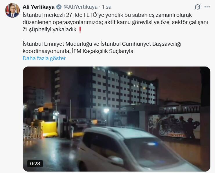 “İstanbul merkezli 27 ilde FETÖ’ye yönelik bu sabah eş zamanlı olarak düzenlenen operasyonlarımızda; aktif kamu görevlisi ve özel sektör çalışanı 71 şüpheliyi yakaladıkİstanbul Emniyet Müdürlüğü ve İstanbul Cumhuriyet Başsavcılığı koordinasyonunda, İEM Kaçakçılık Suçlarıyla Mücadele ile İstihbarat Şube Müdürlüğünce yapılan çalışmalar sonucu; İstanbul merkezli Adana, Aksaray, Ankara, Antalya, Balıkesir, Batman, Bolu, Çanakkale, Gaziantep, İzmir, Kayseri, Kocaeli, Konya, Kırıkkale, Kırşehir, Manisa, Malatya, Muş, Sakarya, Sivas, Tekirdağ, Amasya, Aydın Bursa, Mersin ve Zonguldak’ta düzenlenen operasyonlarda yakalanan şüphelilerin;
