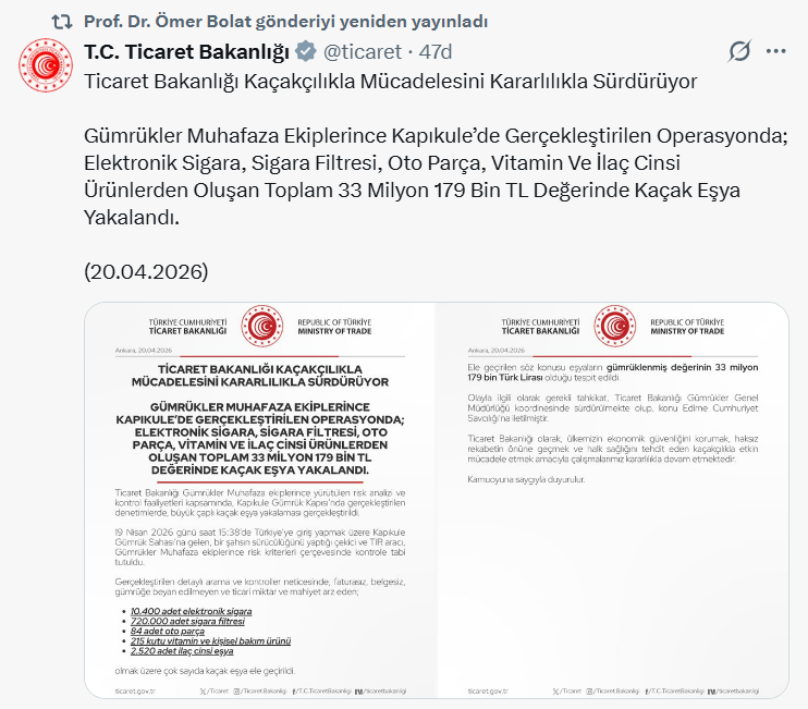 Bakanlık, ekonomik güvenliğin korunması ve haksız rekabetin önlenmesi amacıyla kaçakçılıkla mücadelenin kararlılıkla devam edeceğini vurguladı.