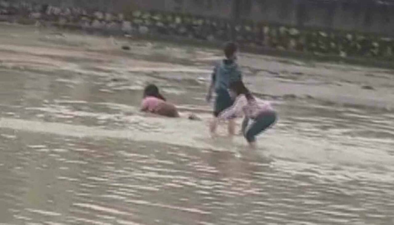Sağanak yağış sonucu meydana gelen sel nedeniyle yollar göle dönerken, çocuklar tehlikeye aldırış etmeksizin sel sularında oyun oynadı.
