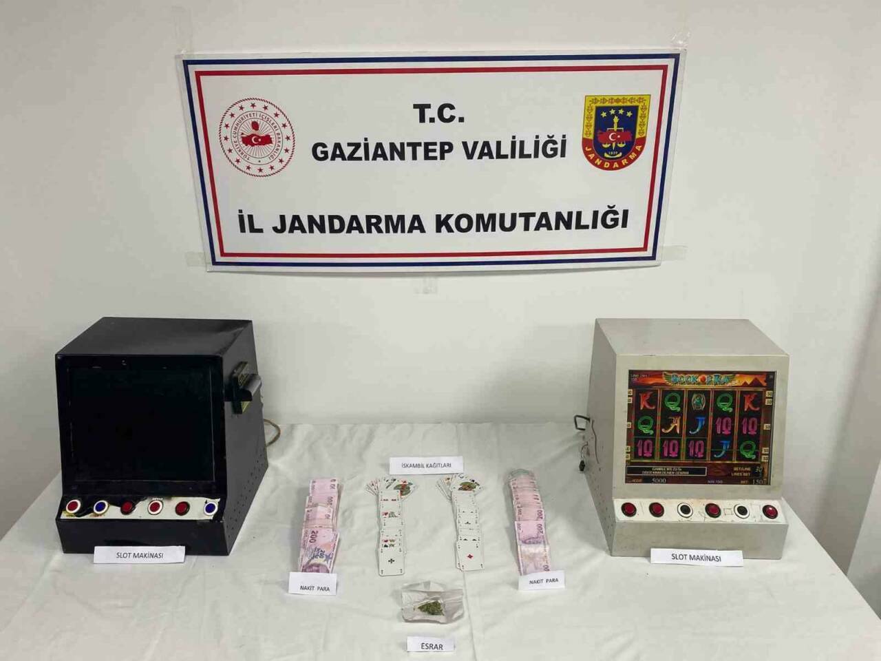 Gaziantep’te bir iş yerine gerçekleştirilen operasyonda jandarma ekipleri, kumar oynarken suçüstü yakaladıkları 9 kişiyi adli makamlara teslim etti. Gaziantep İl Jandarma Komutanlığı ve Cumhuriyet Başsavcılığı tarafından koordine edilen operasyonda Nizip ilçesinde gerçekleştirilen denetimde, iş yerlerinde kumar oynandığı belirlendi. İş yerinde yapılan aramalarda 2 gram kubar esrar, 2 adet slot makinesi, 2 deste iskambil kağıdı ve 45 bin 155 TL nakit para ele geçirildi. Kumar oynayan 9 şahsa idari para cezası kesilirken, M.T.ve M.S. isimli şahıslar hakkında ‘Kumar Oynanması İçin Yer ve İmkan Sağlama ve Kullanmak için Uyuşturucu veya Uyarıcı Madde Satın Almak, Kabul Etmek, Bulundurmak ve Kullanmak’ suçlarından adli ve idari soruşturma başlatıldı.