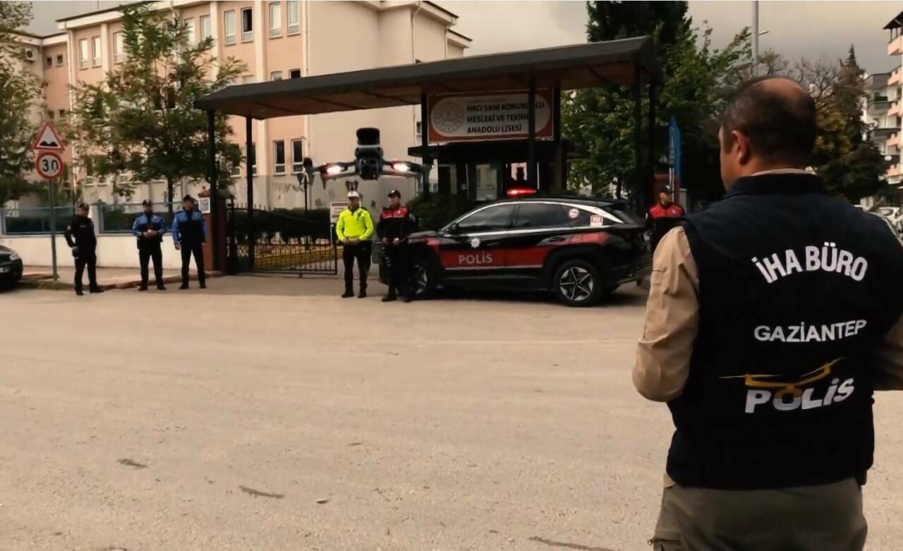 Gaziantep’te polis ekipleri, okul çevrelerinde dron destekli huzur ve güven uygulaması gerçekleştirdi.
