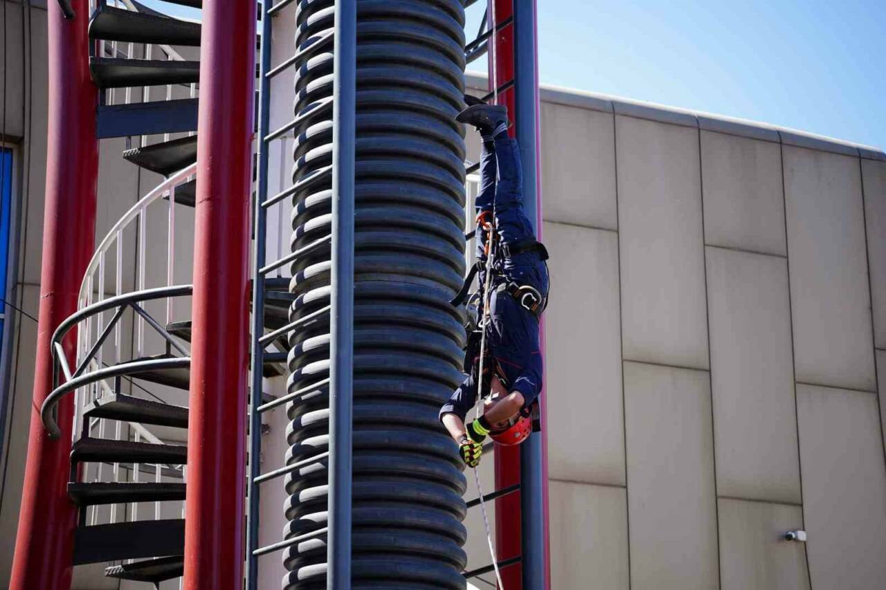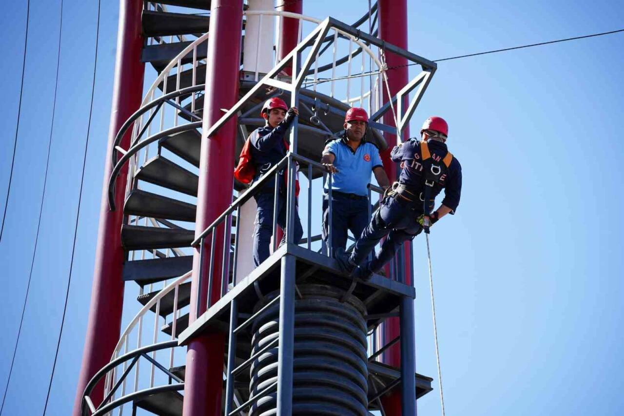 Etkinliğin ilk bölümünde, kurtarma ekibine bağlı personel yangın merdivenine kurulan özel düzenekle ip yardımıyla hızlı bir şekilde aşağı indi. İzleyenlere gerçek bir tatbikat havası yaşatan iniş sırasında personelin gösterdiği çeviklik ve disiplin dikkat çekti. Bu antrenman, kurtarma operasyonlarındaki hazırlık ve reflekslerin ne kadar önemli olduğunu bir kez daha ortaya koydu.