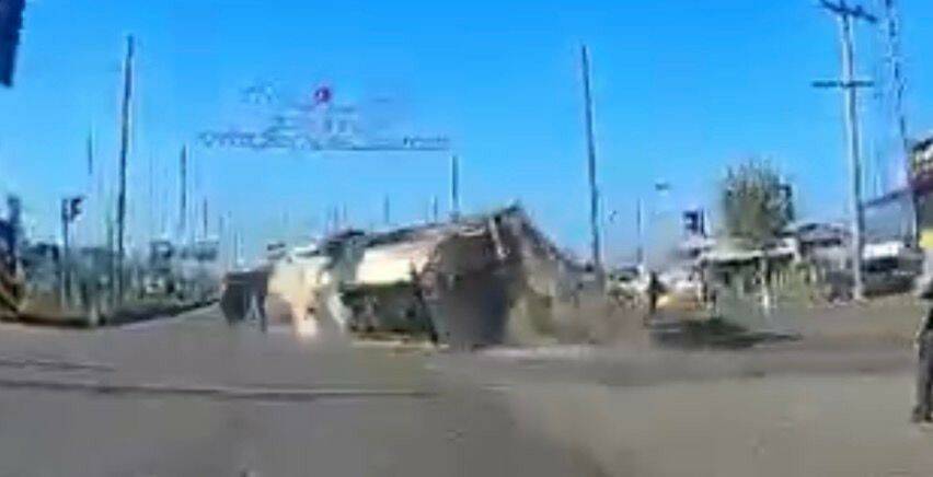 Kaza anı, kavşaktaki başka bir aracın güvenlik kamerasına yansıdı. Görüntülerde, kavşaktan dönmeye çalışan tırın bir anda kontrolden çıkarak devrilmesi ve ortalığı toz bulutu kaplaması yer aldı.