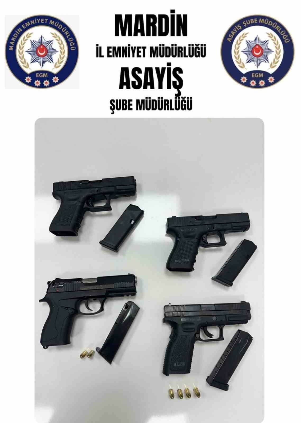 Mardin’in Artuklu ilçesinde polis ekipleri tarafından durdurulan bir araçta yapılan aramada 4 ruhsatsız tabanca bulundu. Araç içerisinde ele geçirilen tabancaların yanı sıra tabancalara ait şarjörler ve 6 adet tabanca fişeği de bulundu. Olayla ilgili 1 şüpheli gözaltına alındı ve hakkında adli işlem başlatıldı.