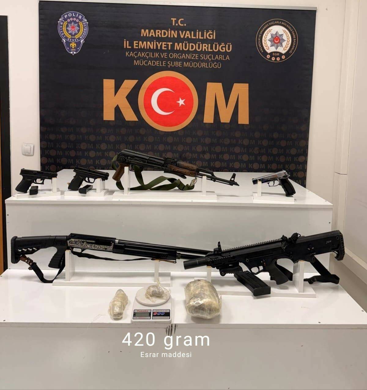 Mardin’in Nusaybin ilçesinde polis ekipleri tarafından gerçekleştirilen silah kaçakçılığı operasyonunda 3 kişi gözaltına alındı. İl Emniyet Müdürlüğü Kaçakçılık ve Organize Suçlarla Mücadele Şubesi ekiplerince yapılan operasyonda, yasa dışı silah alım-satım ve kaçakçılığı yaptığı belirlenen 3 şüphelinin evlerinde aramalar gerçekleştirildi. Aramalarda 1 kalaşnikof uzun namlulu silah, 2 otomatik av tüfeği, 2 ruhsatsız tabanca, 23 av tüfeği kartuşu, 13 adet tabanca fişeği, uzun namlulu silah parçaları, 1 kurusıkı tabanca, 420 gram esrar ve 1 hassas terazi ele geçirildi. Gözaltına alınan şüpheliler hakkında adli işlem başlatıldı.