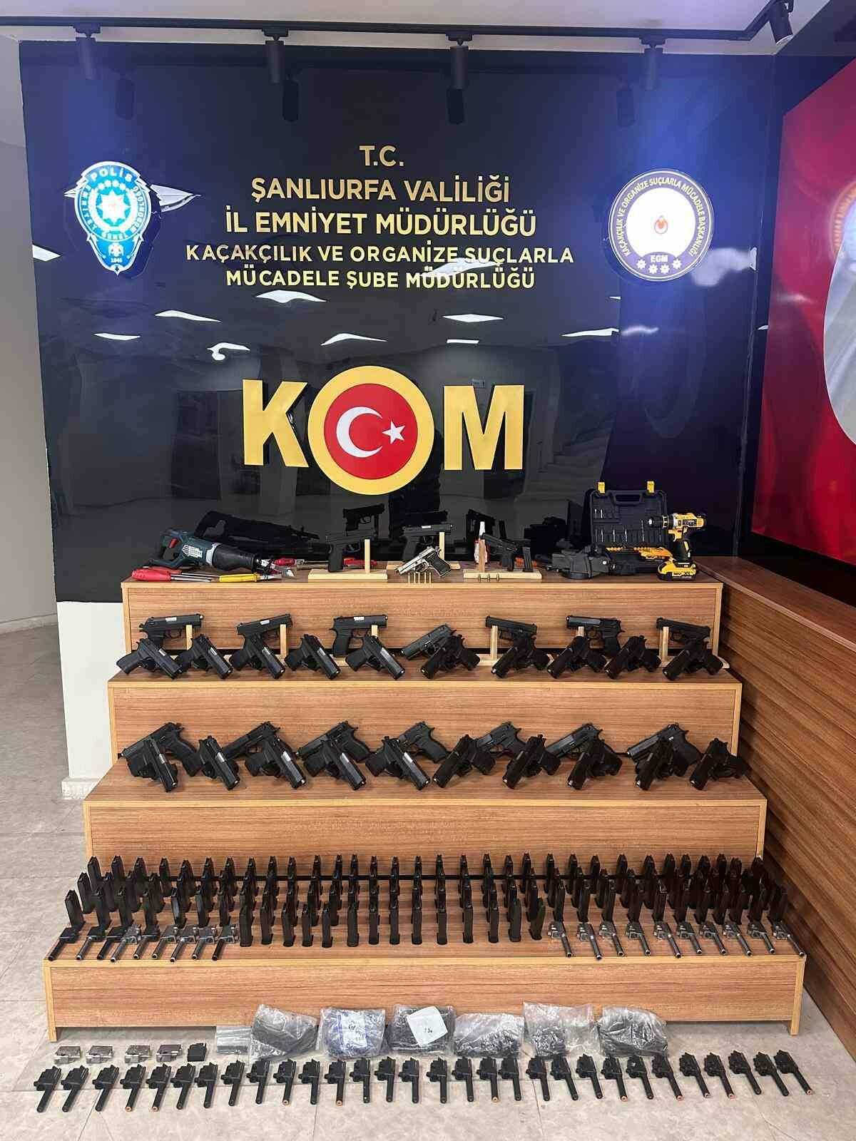 Şanlıurfa'da polis ekipleri tarafından gerçekleştirilen operasyonda 37 ruhsatsız silahın bulunduğu adrese baskın düzenlendi. Baskında 3 şüpheli şahıs gözaltına alındı. Şahısların emniyetteki işlemleri sürüyor. Operasyonda birçok silah ve silah parçası ele geçirildi.