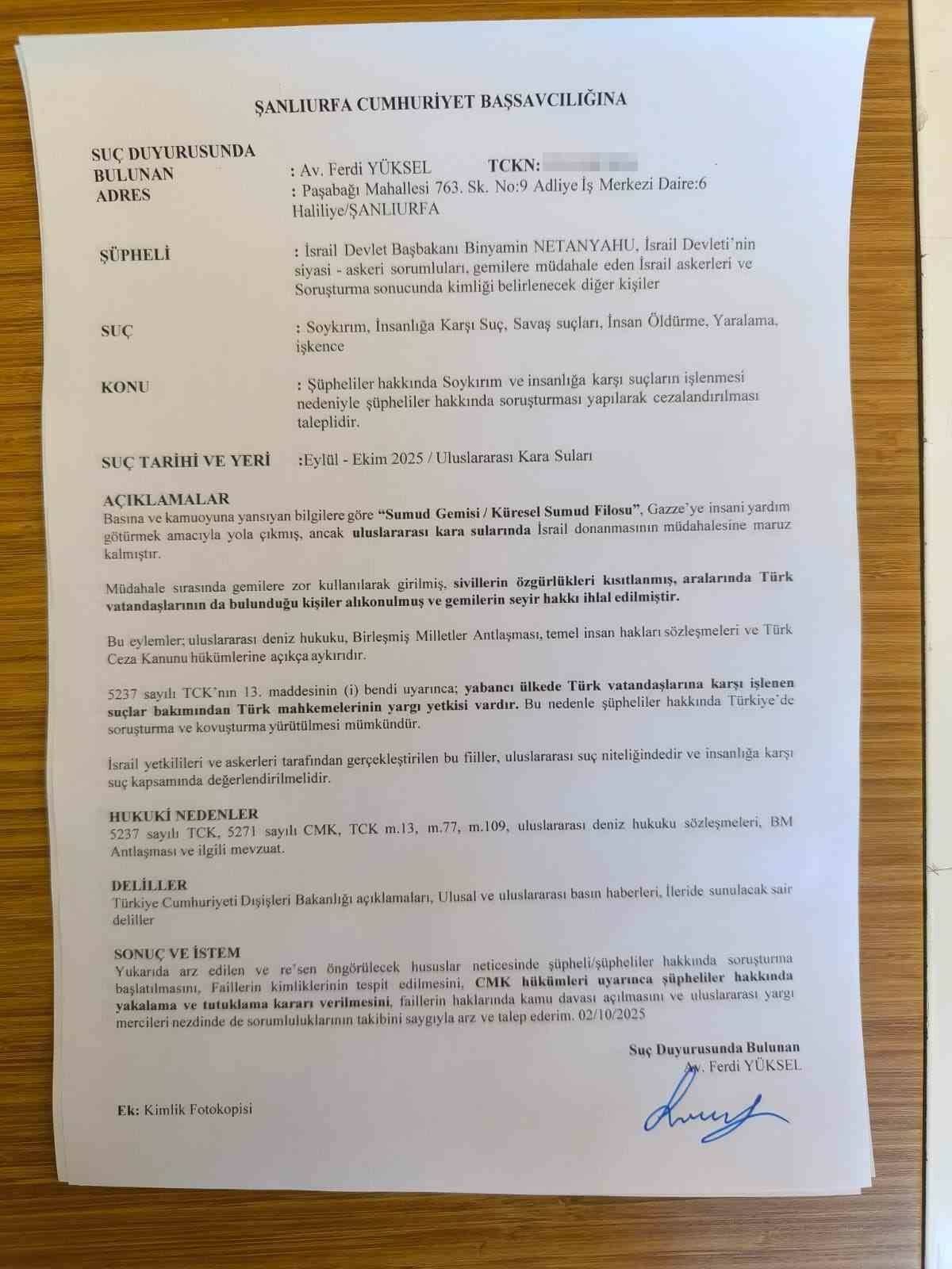 Şanlıurfa Cumhuriyet Başsavcılığı’na sunulan dilekçede, İsrail donanmasının uluslararası sularda insani yardım götüren Küresel Sumud Filosu’na müdahale ettiği, bu sırada Türk vatandaşlarının da bulunduğu gemide ciddi hak ihlalleri yaşandığı vurgulandı.