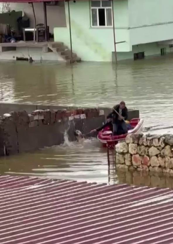 Diyarbakır’da son günlerde etkili olan sağanak yağış bazı noktalarda sel ve taşkınlara neden oldu. Yaşanan su baskınları nedeniyle binlerce dönüm arazi ve bazı evler de su altında kaldı. Kocaköy ilçesine bağlı Şerifoğlları Mahallesi’nde meydana gelen selde de bazı evler suya gömüldü. Vatandaşlar kendi imkanlarıyla yüksek noktalara çıkarken, bir evde köpeğin mahsur kaldığını gören vatandaşlar, bota atlayıp hayvanın yanına kadar gitti. Köpeği bulunduğu yerden botla alan vatandaşlar, daha sonra hayvanı doğan yaşam alanına bıraktı.