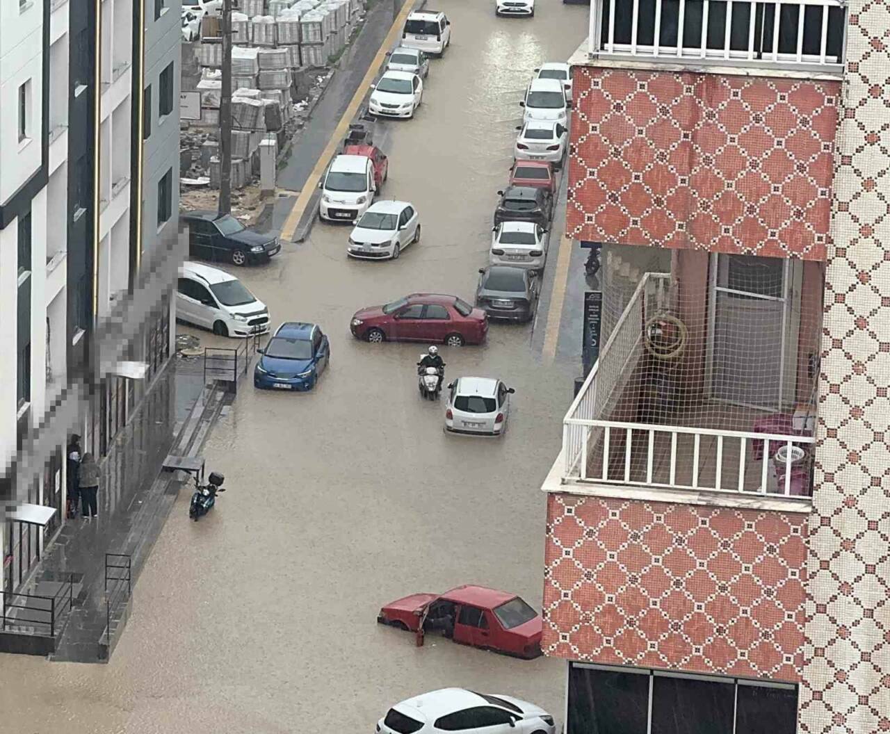 Kentte aniden bastıran sağanak, hayatı olumsuz etkilerken, 13 Mart Mahallesi’nde yağmur suyu birikintisinde mahsur kalan motosiklet sürücüsü, ilerleyemeyince motosikletini bırakıp yanındaki otomobilin üzerine çıkıp karşıya geçerek canını kurtardı.