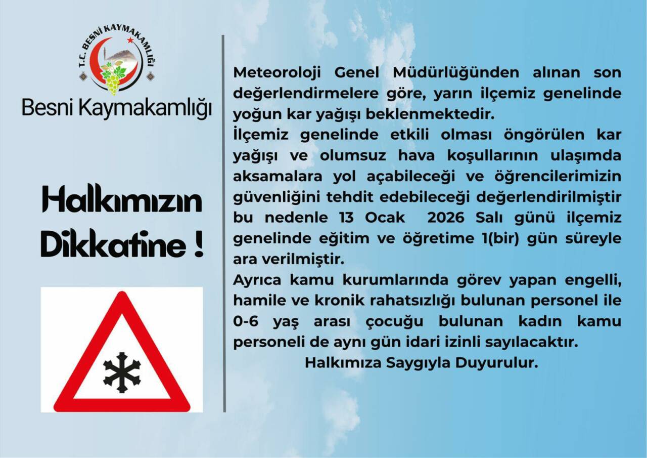 Meteoroloji Genel Müdürlüğü’nden alınan son değerlendirmelere göre, ilçe genelinde yoğun kar yağışı ve olumsuz hava koşullarının ulaşımda aksamalara yol açabileceği ve öğrencilerin güvenliğini tehdit edebileceği belirtildi. Bu kapsamda Besni ilçesinde 13 Ocak 2026 Salı günü eğitim ve öğretime 1 gün süreyle ara verildi.