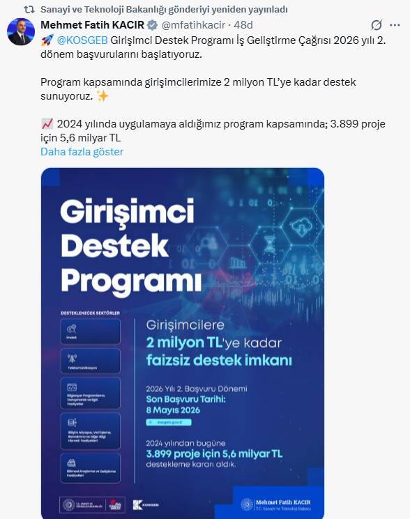 Sanayi ve Teknoloji Bakanı Mehmet Fatih Kacır, KOSGEB Girişimci Destek Programı kapsamında 2026 yılı 2. dönem başvurularının başladığını duyurdu.