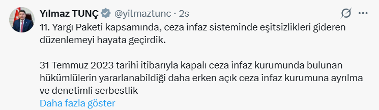 Bakan Tunç X hesabı üzerinden yaptığı açıklamada; “31 Temmuz 2023 tarihi itibarıyla kapalı ceza infaz kurumunda bulunan hükümlülerin yararlanabildiği daha erken açık ceza infaz kurumuna ayrılma ve denetimli serbestlik uygulamasından, aynı tarihte veya daha önce işlenen suçlar nedeniyle hükümlü olanların da yararlanabilmesi sağlanmaktadır. Böylece suç tarihi itibarıyla benzer durumda olan hükümlüler arasında ortaya çıkan farklılıklar giderilmekte; infazda eşitlik ilkesi güçlendirilmektedir.