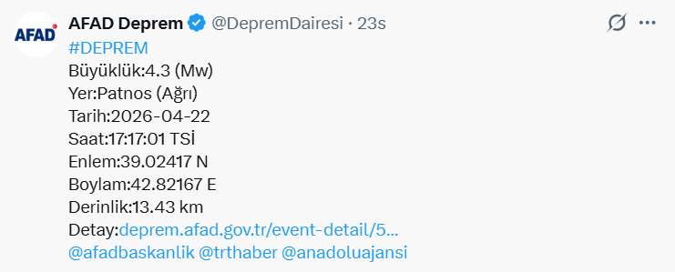 Afet ve Acil Durum Yönetimi Başkanlığı (AFAD), Ağrı’nın Patnos ilçesinde 4.3 büyüklüğünde bir deprem meydana geldiğini açıkladı.