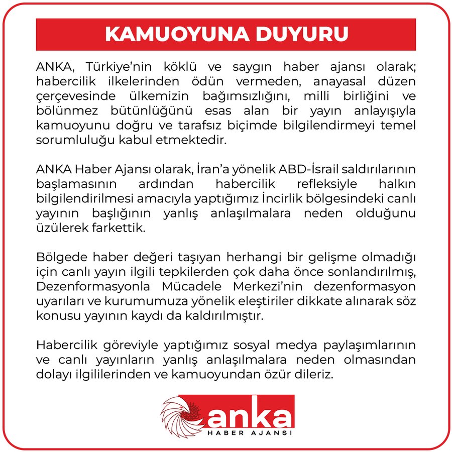 ANKA Haber Ajansı olarak, İran’a yönelik ABD-İsrail saldırılarının başlamasının ardından habercilik refleksiyle halkın bilgilendirilmesi amacıyla yaptığımız İncirlik bölgesindeki canlı yayının başlığının yanlış anlaşılmalara neden olduğunu üzülerek fark ettik.