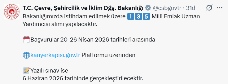 Çevre, Şehircilik ve İklim Değişikliği Bakanlığı, 135 Milli Emlak Uzman Yardımcısı alımı yapacağını duyurdu. Başvurular 20-26 Nisan tarihleri arasında alınacak.