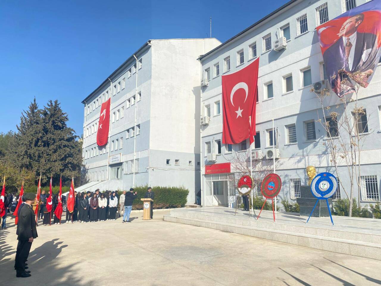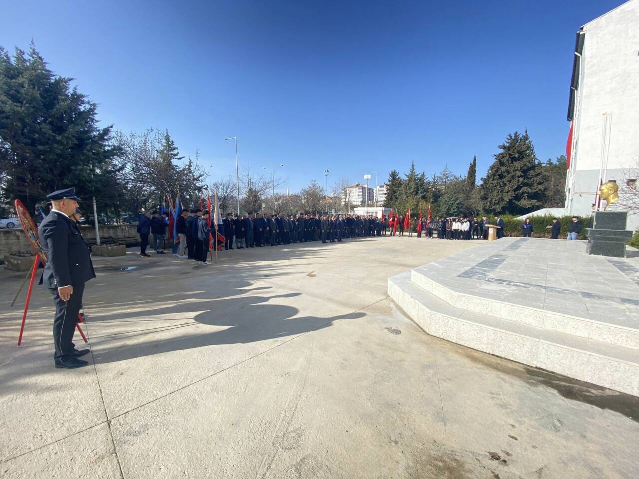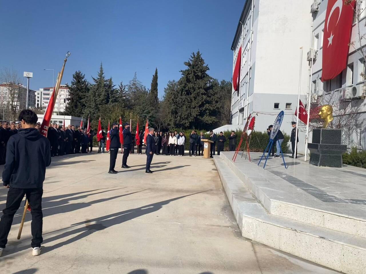 Kaymakamlık binası önündeki Atatürk Anıtı’na çelenk sunulmasıyla başlayan programda, saygı duruşunda bulunuldu ve ardından İstiklal Marşı okundu.