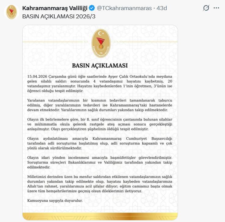 Kahramanmaraş Valiliği, 15 Nisan 2026 tarihinde öğle saatlerinde Onikişubat ilçesinde bulunan Ayser Çalık Ortaokulu’nda meydana gelen silahlı saldırıya ilişkin yazılı basın açıklaması yayımladı.