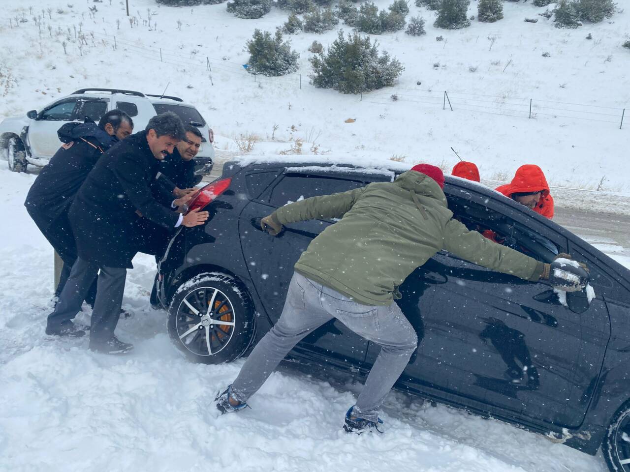 Adıyaman’ın Besni ilçesinde yoğun kar yağışı nedeniyle kapanan yolların ulaşıma açılması için sahada görev yapan ekiplerle birlikte çalışmaları takip eden Kaymakam Aslan, kar nedeniyle yolda kalan araçlara da ekiplerle birlikte destek verdi. Bu sırada deprem konutları civarında, Besni istikametinden Gaziantep istikametine doğru seyir halindeki 01 CHU 01 plakalı otomobil kayarak orta refüje saplandı. Aracın bulunduğu yerden çıkarılması için AFAD ekipleri ile birlikte çalışmalara katılan Kaymakam Aslan, ziyaret sırasında görev başındaki personele kolaylıklar dileyerek vatandaşların güvenli ulaşımı için çalışmaların aralıksız sürdürüleceğini ifade etti.