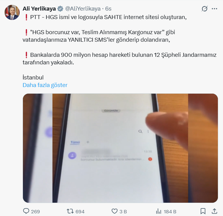 PTT ve HGS Adıyla Dolandırıcılık: Bakan Yerlikaya: “900 Milyon TL Hesap Hareketi Olan 12 Şüpheli Yakalandı”