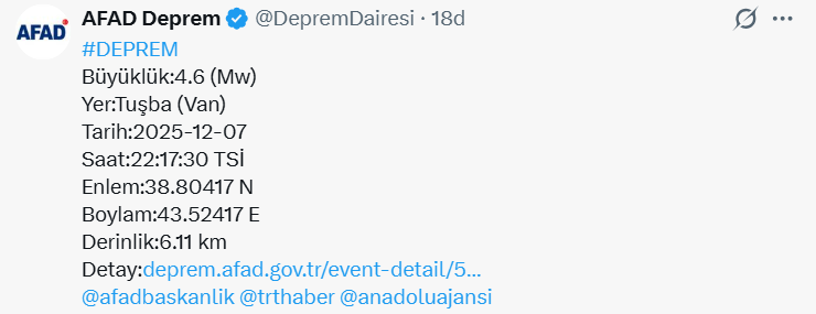 Depremin merkez üssü Tuşba olarak açıklanırken, ilk belirlemelere göre olumsuz bir ihbar yapılmadı. Yetkililer bölgede saha taramalarının sürdüğünü bildirdi.