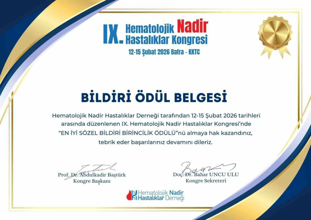 GAÜN Hematoloji Bilim Dalı Öğretim Üyesi Prof. Dr. Vahap Okan ve ekibinde yer alan Transfüzyon Merkezi Sorumlusu Mustafa Tekin tarafından 9. Hematolojik Nadir Hastalıklar Kongresi’nde sunulan çalışma, “En İyi Sözel Bildiri” birincilik ödülüne layık görüldü.
