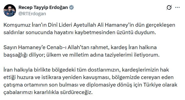 “Komşumuz İran’ın Dinî Lideri Ayetullah Ali Hamaney’in dün gerçekleşen saldırılar sonucunda hayatını kaybetmesinden üzüntü duydum.