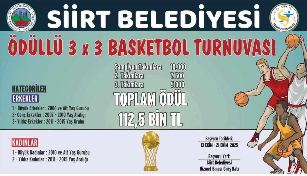 Siirt Belediyesi tarafından düzenlenecek "3x3 Sokak Basketbolu Turnuvası" 22-26 Ekim 2025 tarihleri arasında 5 farklı kategoride gerçekleşecek. Turnuvada büyük erkekler, genç erkekler, yıldız erkekler, büyük bayanlar ve yıldız bayanlar olmak üzere 5 farklı kategoride mücadeleler yapılacak. Dereceye girecek takımlara ödül olarak toplam 112 bin 500 lira ve çeşitli hediyeler verilecek. Başvurular ise 13-21 Ekim 2025 tarihleri arasında Siirt Belediyesi Hizmet Binası'nda yapılacak.