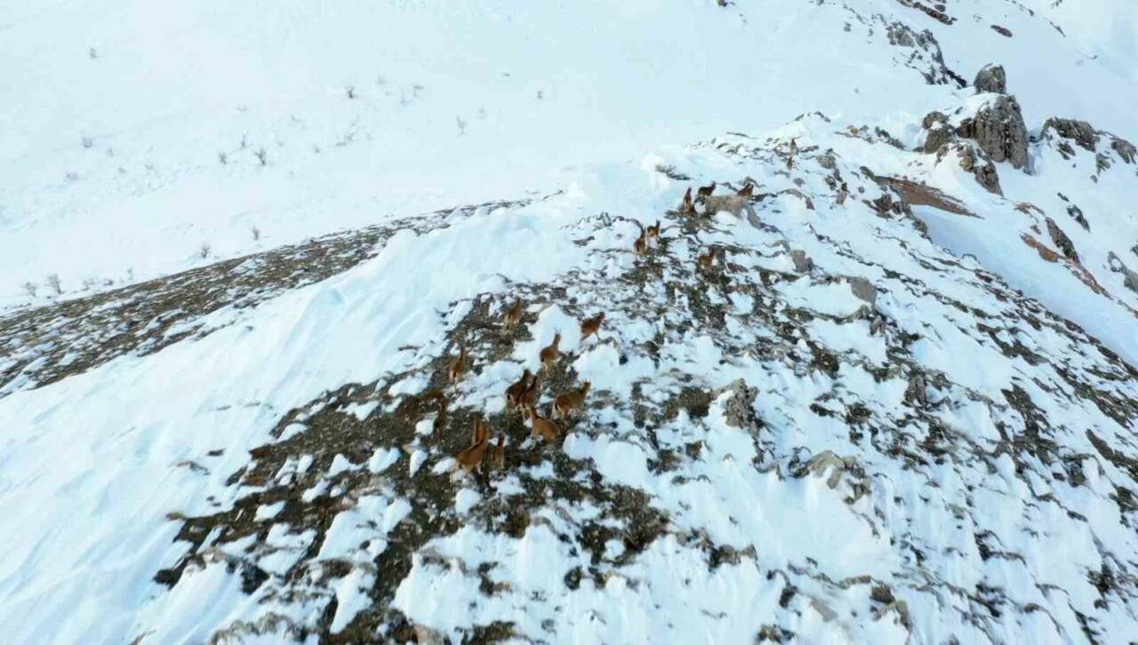Koçali Köyü yakınlarında ve rakımı yüksek dağlık bölgelerde yaşayan yaban keçileri, yağan kar ile birlikte yiyecek bulmakta zorluk çekiyor. Yiyecek bulmak için sürüler halinde kar üzerinde ilerleyen yaban keçileri, drone ile havadan görüntülendi. Onlarca yaban keçisinin, 1 metreyi geçen kar kalınlığının olduğu yerlerden kayalık bölgelere giderek yiyecek aradığı görüldü.
