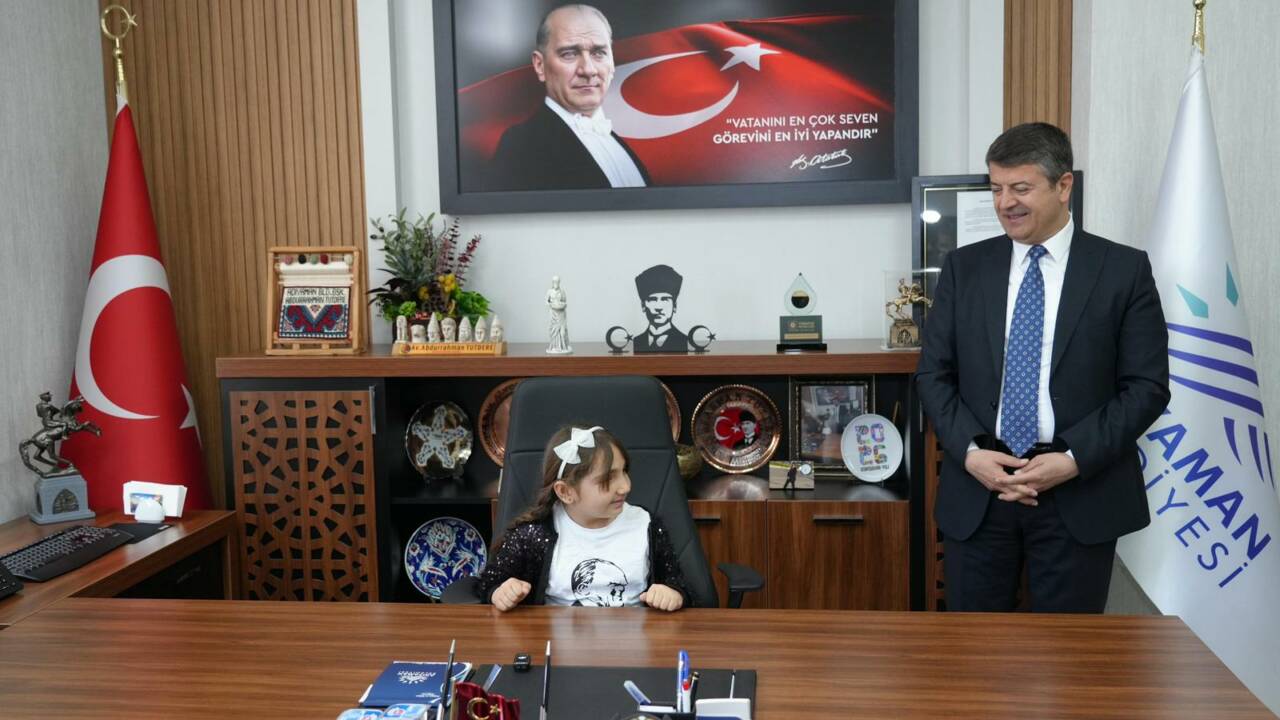 Temsili olarak belediye başkanlığı makamına oturan Mehmetçik İlkokulu 4. sınıf öğrencisi Meryem Aydın, çocukların güvenli ve sağlıklı bir şehirde yaşama hakkına vurgu yaptı.