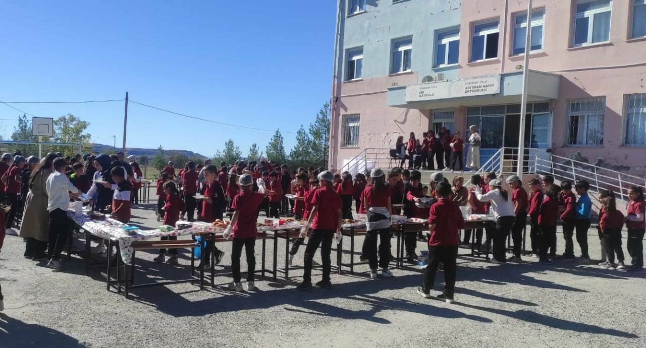 - ÖĞRENCİLERDE TOPLUMSAL SORUMLULUK BİLİNCİNİ VE DEĞERLER EĞİTİMİNİ PEKİŞTİRMEYİ AMAÇLAYAN ANLAMLI ETKİLİKTE KURU VE YAŞ PASTA, ÇİĞKÖFTE, MEYVE, İÇECEKLER MERCİMEK KÖFTESİ, İÇLİ KÖFTE, KISIR, PATATES SALATASI GİBİ ÜRÜNLER YER ALDI.
