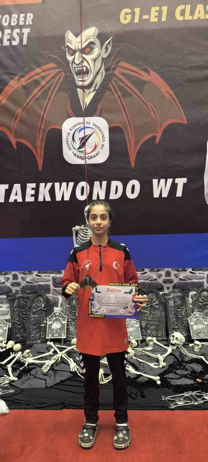 ROMANYA’NIN BAŞKENTİ BÜKREŞ’TE 25-26 EKİM 2025 TARİHLERİNDE DÜZENLENEN ULUSLARARASI DRACULA OPEN TAEKWONDO TURNUVASI’NDA ÜLKEMİZİ TEMSİL EDEN ŞAHİNBEY BELEDİYESPOR KULÜBÜ SPORCUSU CEREN AĞDOĞAN, 33 KİLOGRAM KATEGORİSİNDE ALTIN MADALYAYA UZANARAK BÜYÜK BİR BAŞARIYA İMZA ATTI. GENÇ SPORCU, TURNUVADA SERGİLEDİĞİ ÜSTÜN MÜCADELEYLE HEM ŞAHİNBEY’İN HEM DE TÜRKİYE’NİN GURURU OLDU.