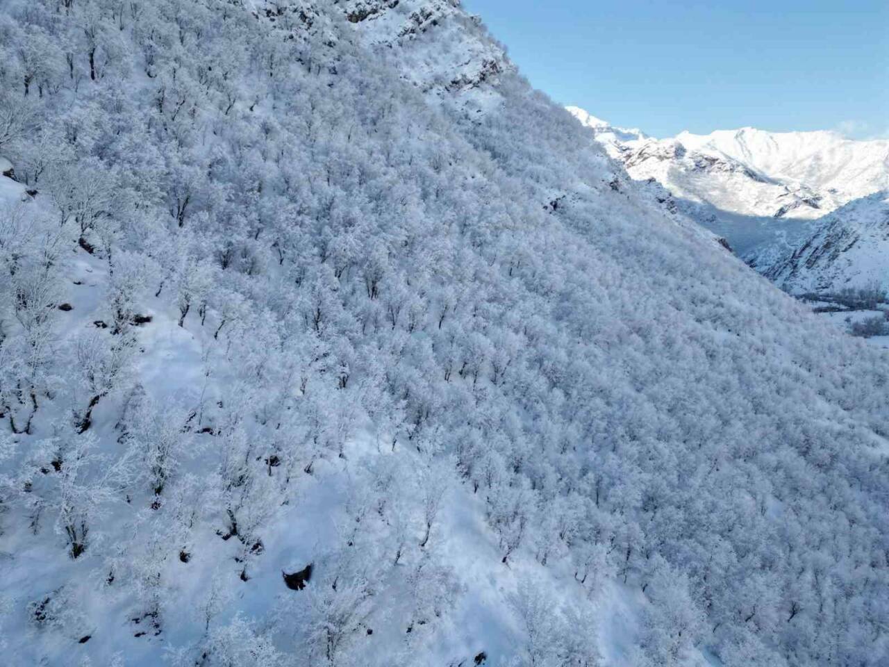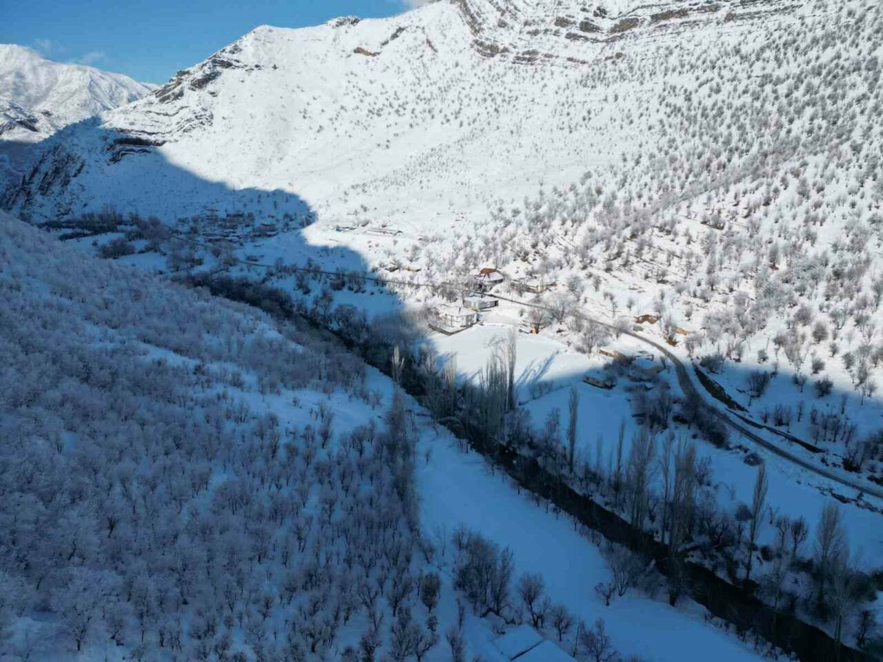 Beytüşşebap ilçesinde kar yağışı sonrası oluşan dondurucu soğuklar, buzlanmayı da beraberinde getirdi. Meşe ormanlarının ve evlerin adeta karda kaybolduğu ilçede dereler de buz tuttu. Hava sıcaklığının gece eksi 14 dereceye kadar düştüğü bölge havadan görüntülenirken, kartpostallık görüntüler ortaya çıktı.