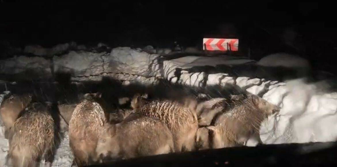 İl Özel İdaresi ekiplerinin Çeltikyolu köyünde karla mücadele çalışmaları sırasında yolda ilerleyen yaban domuzu sürüsü görüldü. O anlar cep telefonu kamerasıyla kaydedildi. Görüntüde, sürücünün karlı yolda koşarak ilerleyen domuzlara “yol verin” diye seslenmesi de yer aldı.